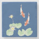 Un dessous de verre en pierre orné d'un tableau d'aquarelle zen idyllique de deux koi dans un étang de koi avec nénuphars blancs et nénuphars (arrière - plan bleu).
