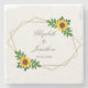Le design présente des tournesols et des feuilles botaniques sur un cadre géométrique imprimé couleur or.