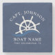 Dessous de verre bleu et blanc marine avec gouvernail et vagues océaniques. Idéal pour un propriétaire de yacht ou un marin. Personnalisez-le en ajoutant votre nom, votre nom de bateau et la ville où vous naviguez.