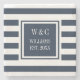 Élégant sous-verre à monogramme personnalisé avec vos initiales, avec un motif rayé bleu marine et blanc, vos initiales et le nom de votre famille avec votre date d'établissement dans un carré bordé de bleu marine avec un texte blanc classique. Conçu par Thisisnotme©