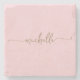 Élégant Chic Moderne Monogramme Nom Signature Écriture Personnalisée Dessous de Verre en Pierre. Ce design présente un nom personnalisé dans une calligraphie manuscrite cursive avec des fioritures (ou typographie) en or sur fond couleur rose blush ou rose pastel. Ceux-ci sont faciles à personnaliser. Cadeau de pendaison de crémaillère féminin élégant et stylé, mariage, également pour un anniversaire, enterrement de vie de jeune fille, fête d'anniversaire pour les 16 ans, fête des mères et c'est pour la fille qui aime les choses uniques et stylées.