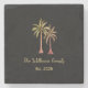 Dessous de verre tropical en pierre noire de plage, avec un dessin de palmiers et des lettrages personnalisables. Un article de décoration de maison d'été amusant qui est parfait pour divertir et profiter du temps chaud.