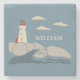 Ce dessous de verre personnalisé est parfait pour boire un verre tout en profitant de la vue sur l'océan depuis votre maison de plage. Il a une simple illustration nautique d'un phare en rouge, crème ou ivoire. Le phare se dresse sur une côte rocheuse avec des vagues qui s'écrasent en contrebas et des nuages crème dans le ciel. Le graphique est positionné contre un arrière - plan bleu français doux.