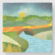 Paysage Abstrait d'une rivière passant sous un pont de pierre avec des collines et une route dorée aux couleurs et textures audacieuses.