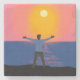Salutation au soleil. Un homme est debout sur une plage face à la mer ouverte et salue le soleil jaune avec des bras levés.