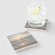 Dessous de verre de pierre avec lever de soleil sur l'océan et "Soyez calme et Sachez que je suis Dieu Psaumes 46:10" écrit dessus. IA générée.