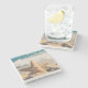 Un dessous de verre en pierre avec une photo pittoresque. Une grande étoile de mer dressée sur une plage de sable. Une belle mer bleue avec des vagues de surf blanc en arrière - plan.