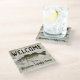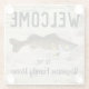 Bienvenue à la maison "Votre nom de famille", ou changez de maison. Un dessous de verre d'accueil à thème pêche pour la famille qui aime pêcher. Le design présente un doré géant sur un arrière - plan rustique.