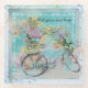 A beautiful spattered polychromatic water colored bicycle with flower flower baskets on blue burlap rimmed with white filigree, and with a greenish gray and white textured border around the blue burlap. crédit: Pixabay.com - Image# 2416366, Image# 489879, Image# 2148492, Image# 1064162