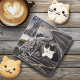 Un chaton smoking noir et blanc est assis à côté d'une gargouille. Derrière eux se trouve un château et des dragons.