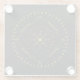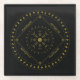 Cycles glass coaster. Cycles is a Germanic design created by Anna M. Asbury and consists of a black background with an Aegishjalmr in the center and encircled by Elder Futhark Runes. The design is enclosed in a diamond with the Ingwaz Rune, flanked on all four sides with a bind rune, and encircled by the Jera and Ingwaz Runes.