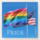 Un dessous de verre à boisson lumineuse avec un drapeau de la rainbow Pride clignotant et un drapeau américain, dressé contre un ciel bleu parfait. Célébration d'une Amérique accueillante et diversifiée. Photographié à Cherry Grove sur Fire Island. Partie de la collection Pride.