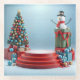 Un rendu 3D vibrant capture l'esprit de Noël avec une scène festive. Un sapin de Noël parfaitement décoré, orné de décorations rouges, bleues et dorées, se dresse à côté d'un podium rouge à plusieurs étages. De l'autre côté, un joyeux bonhomme de neige sort d'une boîte cadeau géante verte surmontée d'un arc rouge vif. Parsemés autour de la base sont enveloppés de cadeaux et de baubles colorés, complétant l'atmosphère joyeuse de vacances.