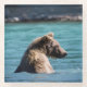The bear's expression is one of quiet focus and stoicism. With its ears perked and its gaze fixed on something downstream, it exemplifies the raw, untamed spirit of the Pacific Northwest. The vibrant, teal-blue water creates a stunning contrast against the earthy tones of the bear’s fur, while the soft-focus background of rocky shoreline emphasizes the solitude and scale of the Alaskan wilderness.