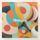 Une peinture moderne du milieu du siècle dans diverses formes géométriques en rouge, turquoise, orange, noir et vert avec monogramme ou nom blanc audacieux.