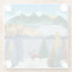 Un magnifique paysage avec des couleurs et des textures uniques montrant un paysage de montagne et de lac et une forêt multicolore avec un soleil levant et un orignal dans les tons de bleu, vert, or, et magenta.