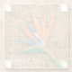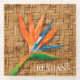Des dessous de verre en verre personnalisés portent votre nom de famille et un oiseau tropical exotique de fleur d'aquarelle paradisiaque sur un arrière - plan en osier tressé. CORRESPONDRE des articles dans notre magasin.