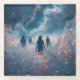 Quatre silhouettes sombres marchent à travers une brume lumineuse, entourées d'étoiles tourbillonnantes et de lumière cosmique.