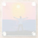 Salutation au soleil. Un homme est debout sur une plage face à la mer ouverte et salue le soleil jaune avec des bras levés.