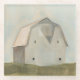 Serene Barn II par Emma Scarvey. Grange simple avec des couleurs douces et muettes dans un champ.