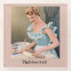 A stylized, retro-inspired image depicts a smiling woman in a pastel blue ruffled dress and white apron, rolling out dough on a kitchen countertop. Her hair is neatly styled in soft curls, and she wears elegant drop earrings, evoking a classic 1950s aesthetic. Baking ingredients and a box of baking mix sit nearby, reinforcing the domestic, vintage kitchen scene. At the bottom of the image, the playful caption “That’s how I roll” adds a humorous, modern twist to the nostalgic setting. The overall tone blends mid-century charm with lighthearted wit.