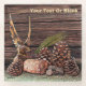 Une nature morte rustique, principalement marron, avec un aigle sculpté acheté en Union Soviétique il y a de nombreuses années. Il se dresse au milieu des cônes de pin, d'une section d'une branche de pin, d'un essaim d'aiguilles de pin et de quelques morceaux de ponce. Tout repose sur une fourrure de caribou (rennes) ; un mur patiné de poutres en bois fait office d'arrière - plan. Customisez en ajoutant votre propre texte.
