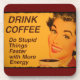 Femme souriante avec rouge à lèvres rétro et ongles boit sa tasse de café du matin. La légende dit : "Buvez du café - Faites des choses stupides plus vite avec plus d'énergie."