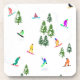 Cool whimsical illustration art of colorful snowboarders, snowboarding downhill in mountains among pine, spruce, fir trees on fresh snow powder. Snowboard and xmas outdoor sport in a winter forest. Snowboarder gifts. Snowboarding Christmas decor.