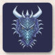 Dessous de verre de dragon bleu avec une illustration numérique de la tête de cette créature magique cool avec des cornes en violet et bleu sur arrière - plan bleu foncé.