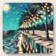 Joli art côtier Ai romantique représentant une rangée de palmiers avec des lumières blanches illuminées. Une jolie réflexion sur la plage de sable et les vagues.