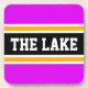 Ce design sportif et coloré présente du texte athlétique LE LAC dans une large bande noire surlignée avec des rayures blanches et jaunes contre des rayures extérieures roses vives. Le texte et les couleurs de ce design peuvent être personnalisés.