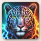 Un visage de léopard néon vibrant présentant un effet de couleur partagée avec une lumière sarcelle et orange lumineuse. Les lignes électriques audacieuses et les yeux intenses créent un look saisissant à fort contraste qui se démarque sur un fond sombre. Cette conception thématique animalière colorée est parfaite pour quiconque aime l'imagerie moderne à haute énergie.