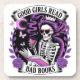 Un design coloré et dynamique présente un squelette féminin lisant un livre tout en sirotant un cocktail torride. Elle est entourée de fleurs violettes et de papillons, ajoutant à l'esthétique animée. Le texte gras et coloré dit : "Les bonnes filles lisent de mauvais livres." Ce design unique est disponible sur une large gamme de produits.