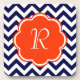 Un cadre orange personnalisable de monogramme est sur un arrière - plan d'un motif audacieux de chevron de bleu marine et de blanc.