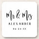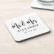 Des dessous de verre de mariage modernes et minimalistes présentent "Monsieur et Madame" dans une police de script brossé noir avec un design de monogramme personnalisé simple et élégant qui peut être personnalisé avec le nom de famille et la date de mariage des mariés. Les couleurs classiques noir et blanc peuvent être modifiées pour coordonner avec votre palette de couleurs de mariage.