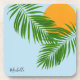 Ce dessous de verre présente un design élégant et minimaliste avec un soleil tropical derrière des feuilles de palmiers sur un arrière - plan bleu ciel. Personnalisez en ajoutant votre nom dans une police de caractères élégante.