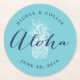 Dessous de verre tropicaux chic pour votre mariage, dîner de répétition, soirée de fiançailles ou fête d'accueil avec "Aloha" en bleu marine calligraphie moderne lettrant sur un arrière - plan aqua turquoise vibrant, superposé sur une illustration d'ananas en blanc. Personnalisez avec vos noms et votre date de mariage en texte incurvé en haut et en bas. Parfait pour les mariages hawaiiens, les mariages de destination, les événements luau et plus.