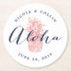 Dessous de verre tropicaux chic pour votre mariage, dîner de répétition, soirée de fiançailles ou fête d'accueil avec "Aloha" en lettres calligraphie moderne bleu marine, superposé sur une illustration d'ananas en rose corail estival. Personnalisez avec vos noms et votre date de mariage en texte incurvé en haut et en bas. Parfait pour les mariages hawaiiens, les mariages de destination, les événements luau et plus.