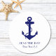Dessous de verre nautiques modernes pour votre bateau qui présentent une illustration bleu marine d'une ancre et le nom et l'emplacement de votre bateau dans une élégante typographie et écriture bleu marine.