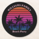 Cool custom beach sunset party paper coasters for a destination wedding or family luau on an island. Cute personalized tropical black decor featuring a pretty pink sky behind beautiful palm trees on the coast.