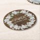 Dessous de verre rustiques chic en papier de carton mariage à l'allure de bois brun, avec des graphiques de la couronne d'haleine fleurie d'un bébé blanc. Personnalisez le texte blanc en fonction de vos besoins. Idéal pour tout événement mariage et fait de belles petites faveurs pour vos invités.