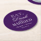 Dessous de verre de mariages royaux ronds violets personnalisés. Mangez une boisson et soyez mariés dessous de verre en papier de fête de mariage fantaisie. Design élégant violet et blanc pour i do bbq, douche nuptiale chic, fiançailles élégant, anniversaire classe, bachelorette amusante etc. Design de typographie classique. Personnalisé avec monogramme ou nom de la mariée et du marié plus la date du mariage. Joli tirage modèle vintage. Cute party supporte le dîner de répétition en plein air. Couleur arrière - plan personnalisable.