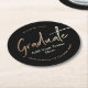 Elégant Unisex Gold et Black Personnalisé Graduation Party Dessous de verre papier, neutre genre, pour lui et elle, dans un design modèle chic élégant avec script texte "diplômé" dans la calligraphie moderne faite par fausse feuille métallique. Vous pouvez changer d'arrière - plan dans n'importe quelle couleur pour mieux correspondre à votre design de marque collège ou lycée. Créez votre propre dessous de verre papier unique en ajoutant le nom, l'école, le collège et la date de fin d'études, ou en les supprimant si vous préférez un design plus minimaliste. Choisissez votre forme préférée entre les coupes de cercle, de coeur, rectangulaire, carrée et jolies sur les bordures. Surprenez vos invités avec cette conception professionnelle et élégante de dessous de verre papier d'études supérieures!