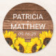 Sous-verre en papier avec noms et date modernes et impression de tournesols ensoleillés sur bois rustique pour faveur de mariage.