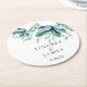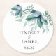 Ce dessous de verre en papier conçu pour un mariage est présenté avec une impression d'art de vigne d'eucalyptus.