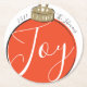 Illustration moderne d'un ornement de Noël rouge de style rétro avec le mot "Joy" en écriture blanche entouré d'un nom et d'une année personnalisés. Le dos peut être customisé avec une photo de famille. Design par Shelby Allison et photo par Jessica Rockowitz sur Unsplash.