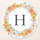 Ce dessous de verre rond personnalisé présente une délicate couronne florale, aux teintes douces de fleurs orange, jaunes et blanches entourant une initiale monogrammée au centre. La lettre "H" est affichée dans une police serif classique, offrant un contraste élégant avec les fleurs naturelles de style aquarelle. La palette de couleurs neutres des fleurs rend ce dessous de verre polyvalent, parfait pour différents styles de décoration maison, de rustique et vintage à moderne. Idéal pour personnaliser votre mariage, votre domicile ou votre événement, ce design initial personnalisé offre une touche à la fois décorative et fonctionnelle à tout endroit.