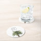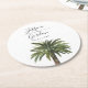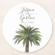 Un ensemble de dessous de verre mariages uniques pour votre événement mariage sur le thème de la plage. Il présente une aquarelle d'un palmier poussiéreux au centre avec les noms uniques de la mariée et du marié au-dessus.