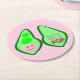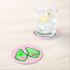 Ce dessous de verre en papier impressionnant présente une image graphique d'un pod vert de pois contenant 2 pois verts et un gros pois rose. Le grand pois rose a un petit visage mignon avec les yeux et une bouche. De l'autre côté de la pod de pois en texte rose foncé il dit "Baby Girl Ready to Pop". Le design est idéal pour une faire-part de grossesse, la révélation de genre ou le baby shower. Il y a un groupe de petits pois roses dans l'arrière - plan.