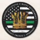 Dessous de verre de retraite militaire de la Ligne verte mince. Célébrez les années de service dévoué, votre retraite militaire et accueillir vos amis et votre famille à votre fête militaire avec ce drapeau rustique de la ligne verte mince avec des bottes d'or de l'armée dessous de verre de retraite militaire. Etats-Unis Drapeau américain dans les couleurs du drapeau militaire, noir vert blanc et or design. Cette serviette de retraite militaire est également parfaite pour la remise des diplômes militaires, le départ d'un soldat, les déploiements et le retour à la maison, le lieu de changement dans la personnalisation. Consultez notre collection pour obtenir des invitations à la retraite, des cadeaux, des faveurs pour la retraite militaire et des fournitures. DROIT D'AUTEUR © 2021 Judy Burrows, Black Dog Art - Tous droits réservés. Retraite militaire Léger Ligne verte Drapeau du Dessous de verre de papier rond de l'Armée